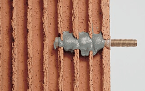 Фиксацию болта обеспечивает резьбовая распорная трубка. Она забивается в посадочное отверстие, после чего расклинивается. В образовавшееся соединение вкручивается несущий стержень.